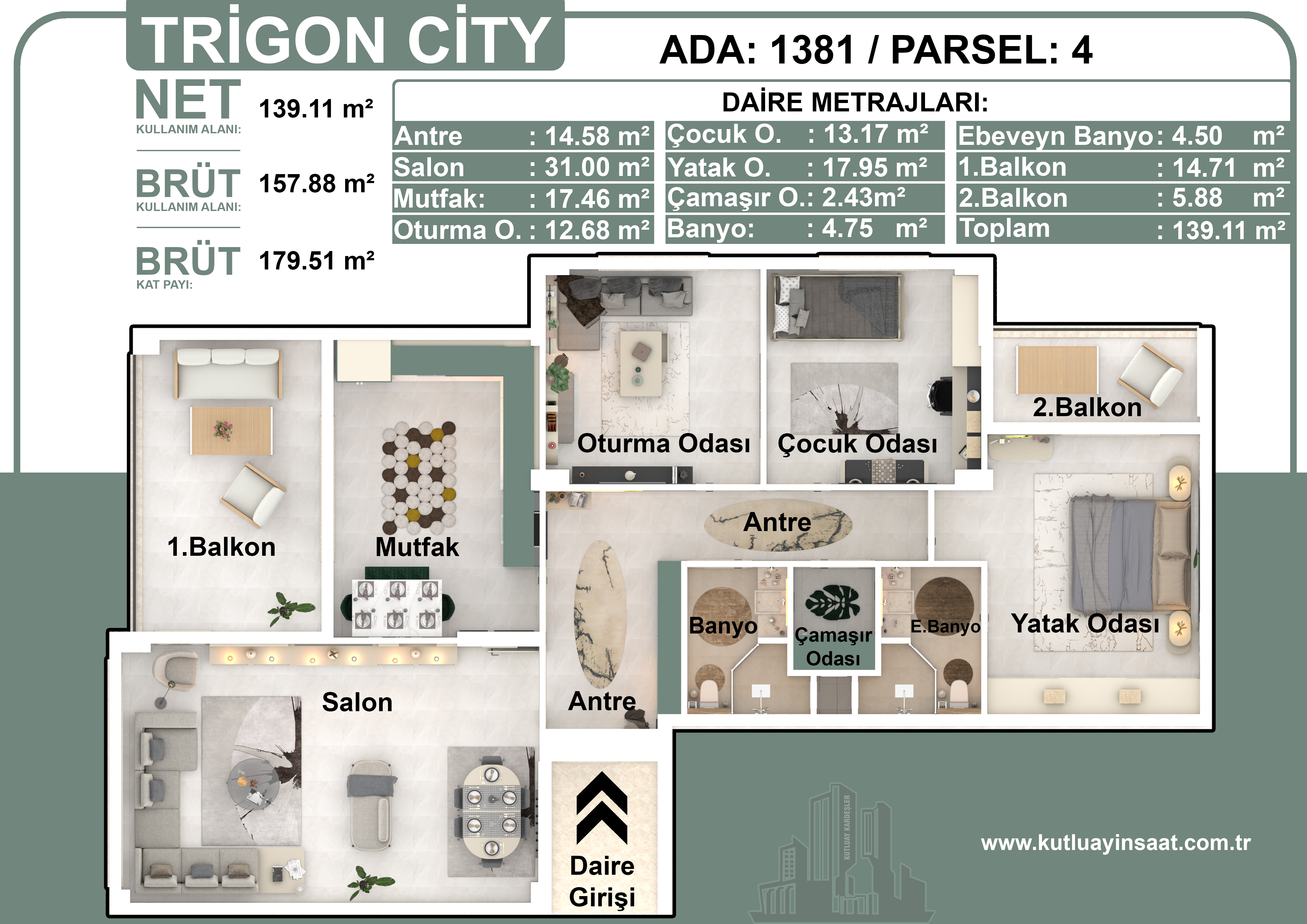 157.88 m² brüt, 139.11 m² net kullanım alanlıyla 3+1 lüks daire seçenekleri